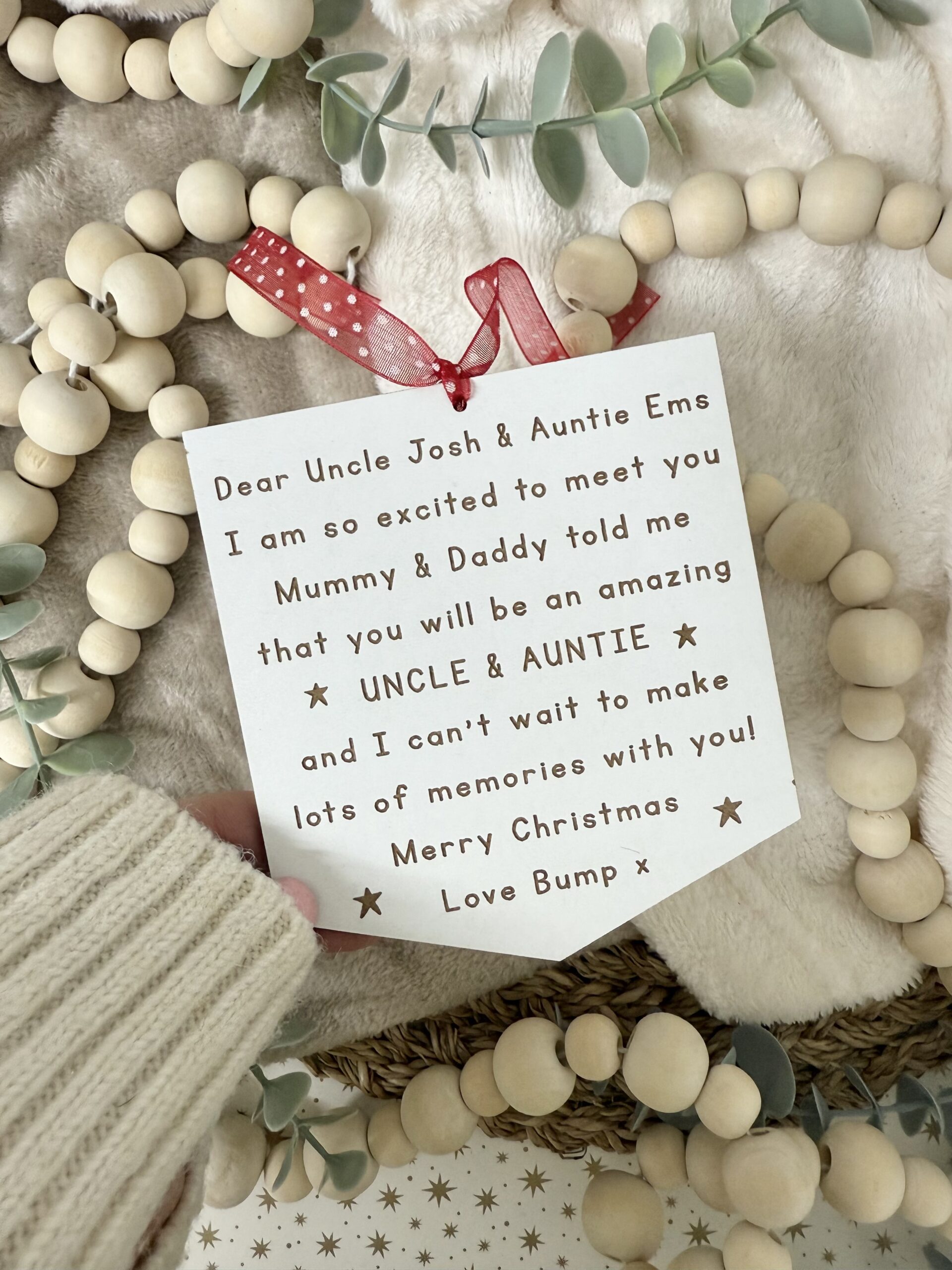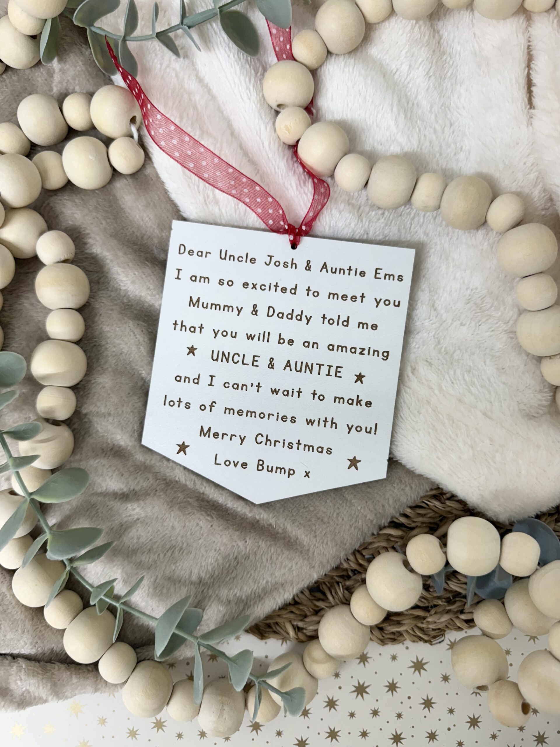 The beautiful white wooden keepsake decoration which will look lovely placed on the Auntie & Uncles Christmas tree this year and every year to come.