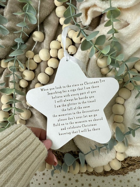 Remember the ones you love this Christmas with this stunning white wooden hanging star beautifully engraved with a heartfelt poem filled with words of love.