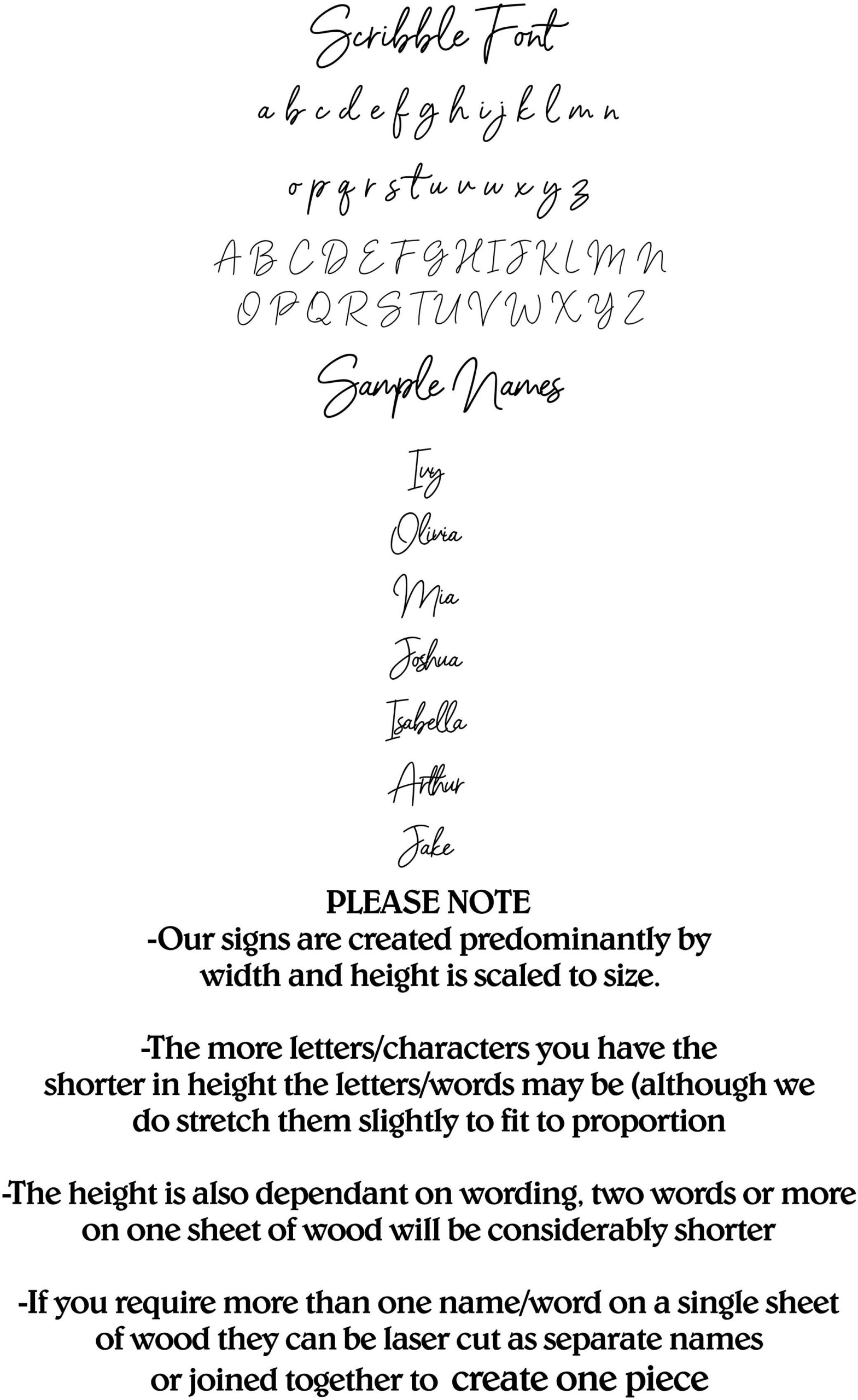 *Height will vary dependant of the amount of letters in the word, if words are ordered over several sheets of wood all words will be cut to the same size to match.